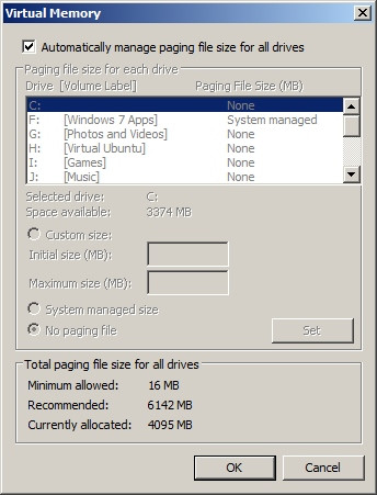 Máy hoạt động chậm hoặc thỉnh thoảng hiện thông báo lỗi có thể là do Page File trên máy tính bị cấu hình sai. Đây là một file trên ổ cứng, được Windows sử dụng làm bộ nhớ ảo để lưu trữ các chương trình và dữ liệu, khi bộ nhớ vật lý (RAM) không đủ chỗ chứa. Để cấu hình lại Page File, bạn truy cập menu Start, click phải chuột vào Computer, chọn Properties. Tiếp theo vào Advanced > Settings > Performance > Advanced. Trong phần Virtual Memory, bạn click nút Change và thay đổi kích thước Page File sao cho lớn hơn lượng RAM trong máy bạn.