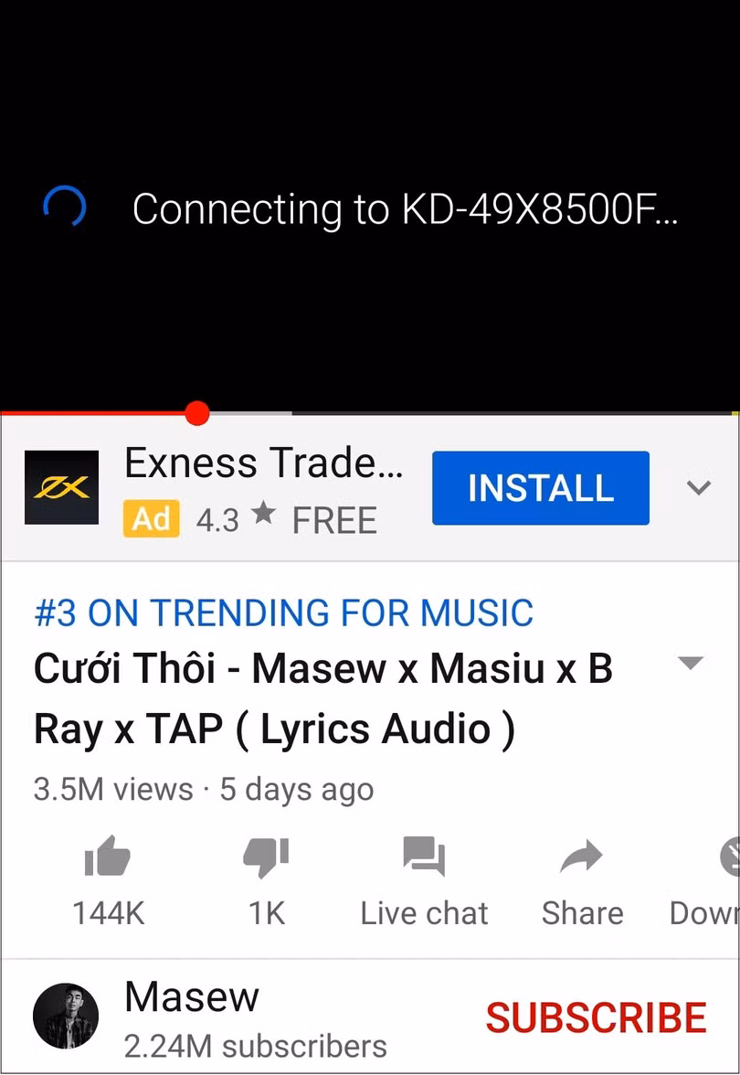 Khi màn hình hiển thị "Connecting" là 2 thiết bị được kết nối và video YouTube sẽ được chiếu lên tivi