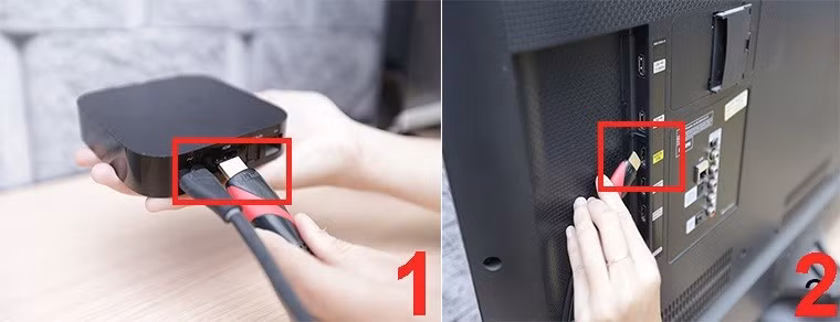 Bước 1: Kết nối Apple TV với tivi bằng cách cắm một đầu sợi cáp HDMI vào Apple TV, đầu còn lại cắm vào tivi.