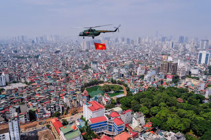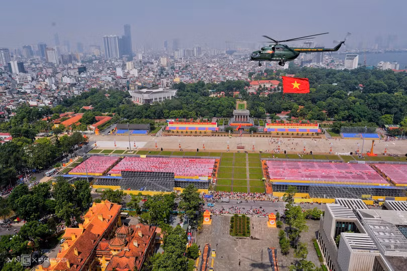 Khoảng 10h, cờ Tổ quốc, cờ Đảng tung bay trên trực thăng khi bay qua quảng trường Ba Đình. Ảnh: Ngọc Thành