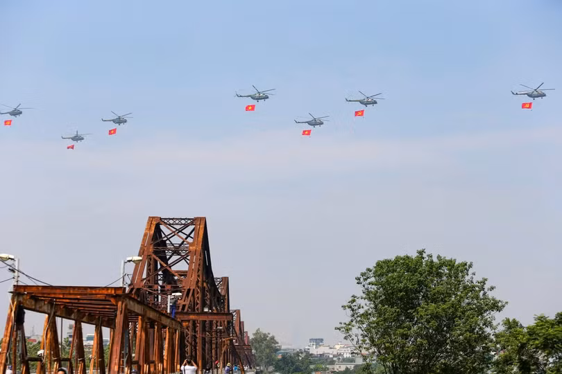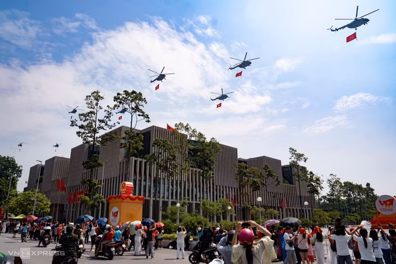 Biên đội trực thăng mang cờ Tổ quốc, cờ Đảng bay qua quảng trường Ba Đình, Nhà Quốc hội. Bên dưới, hàng trăm người dân, du khách hò reo, cổ vũ. Ảnh: Tùng Đinh