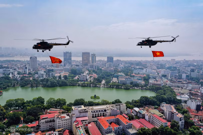 Lúc 9h15, 10 trực thăng lần thứ hai xuất phát từ Hòa Lạc mang theo cờ Đảng, cờ Tổ quốc hướng về trung tâm Hà Nội. Trong ảnh là trực thăng bay qua hồ Hoàn Kiếm (ảnh trước) và Văn Miếu - Quốc Tử Giám. Ảnh: Ngọc Thành