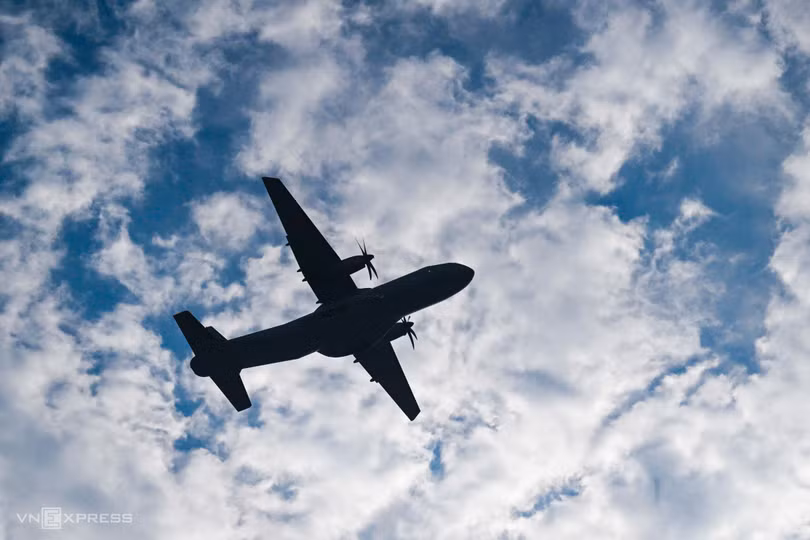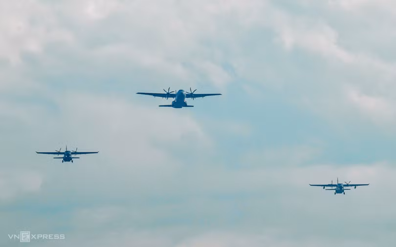 Theo sau biên đội trực thăng là ba chiếc CASA vận tải C-295 và C-212i. Trong ảnh là biên đội CASA bay qua Nhà Quốc hội.