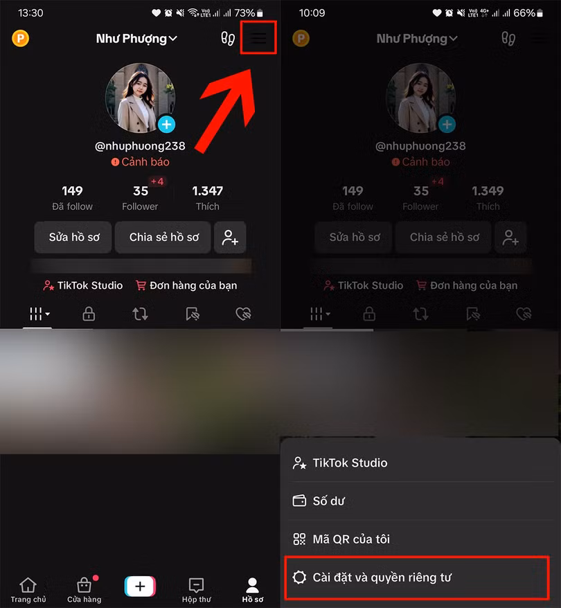 Bước 1: Bạn truy cập vào ứng dụng TikTok > Nhấn chọn vào biểu tượng Hồ sơ ở góc dưới bên phải màn hình > Nhấn chọn vào biểu tượng ba dấu gạch ngang ở góc phải > Nhấn chọn Cài đặt và quyền riêng tư.