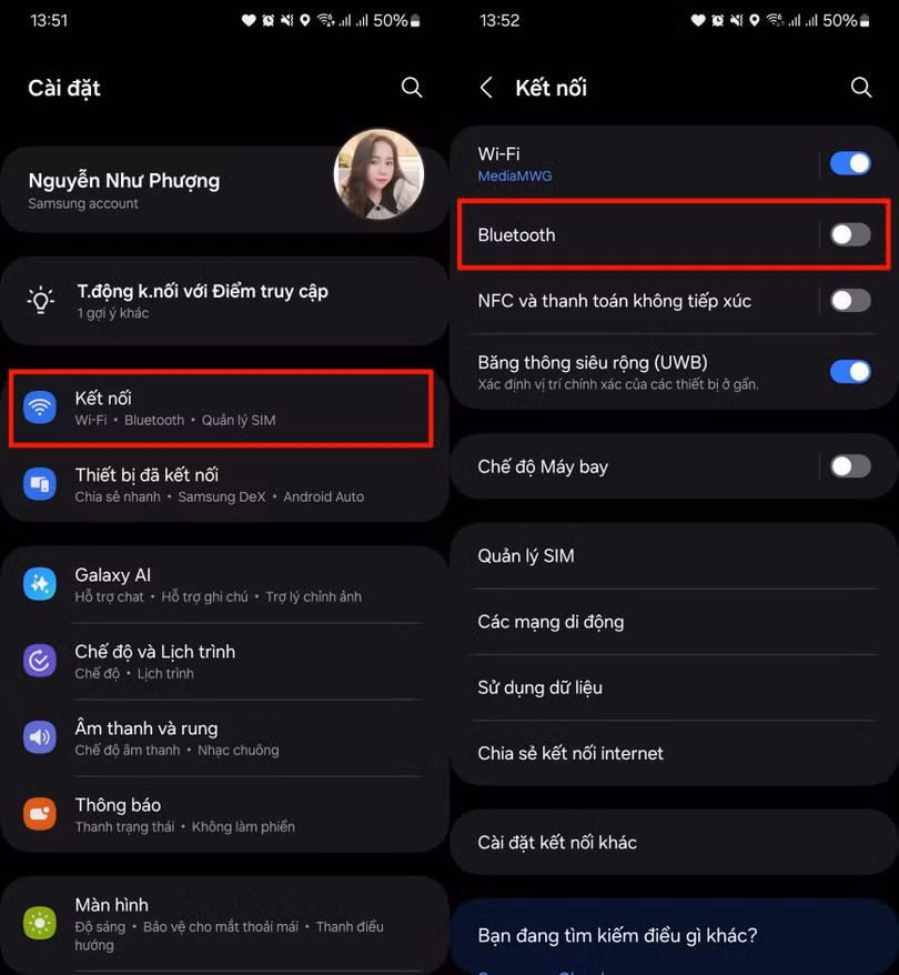Ngoài ra, việc tắt và bật lại Bluetooth cũng giúp điện thoại tìm kiếm lại thiết bị mới, đảm bảo kết nối hoạt động ổn định hơn. Bạn hãy mở ứng dụng Cài Đặt trên điện thoại lên > Nhấn chọn đến mục Kết nối > Chọn vào Bluetooth, sau đó vô hiệu hóa tùy chọn Bluetooth vài giây rồi bật lại nhé.