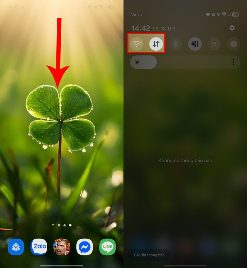 Cách 1: Bạn có thể thử kiểm tra lại kết nối WiFi hoặc dữ liệu di động trên điện thoại. Hãy vuốt từ trên màn hình xuống > Mở thanh trạng thái >Hãy tiến hành Tắt rồi bật lại WiFi hoặc dữ liệu di động để làm mới kết nối mạng.