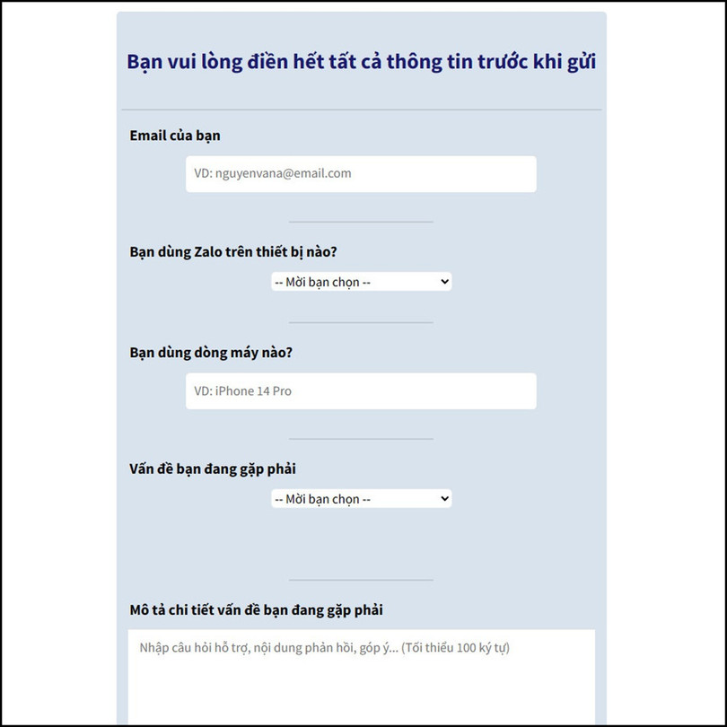 Cách khắc phục khá đơn giản. Bạn hãy truy cập vào trang hỗ trợ của Zalo và gửi yêu cầu xác minh tài khoản tại đường link mình để bên dưới. Sau khi nhấn vào link, hãy điền đầy đủ thông tin được yêu cầu như số điện thoại, mô tả vấn đề đang gặp phải và gửi yêu cầu hỗ trợ. Bộ phận hỗ trợ của Zalo sẽ kiểm tra và phản hồi để giúp bạn mở lại tài khoản nếu không phát hiện vi phạm.