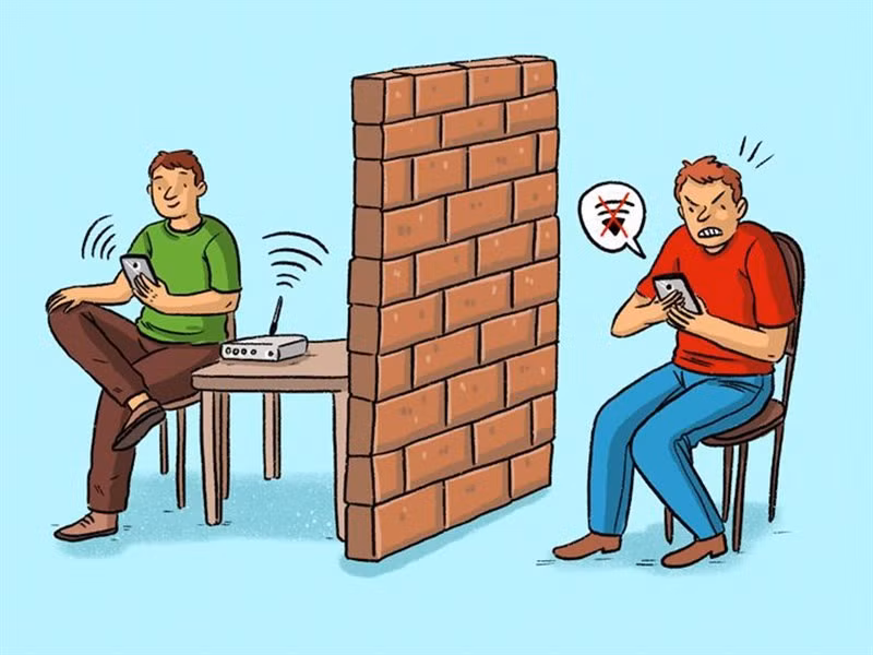 Một số loại tường ngăn tín hiệu Wifi của bạn như: Đá hoa cương, đá cẩm thạch, xi măng, bê tông, thạch cao và gạch. Điều này giải thích tại sao ở những ngôi nhà 2 tầng, mọi người thường gặp phải tình trạng kết nối Internet rất yếu ở một trong các tầng. Để khắc phục điều này, hãy đặt bộ định tuyến của bạn ở một khu vực thoáng và cách xa các bức tường.