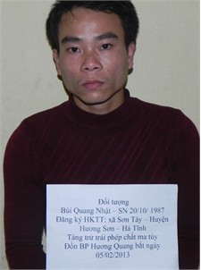 Vào lúc 5h30 ngày 05/2 tại khu vực Cầu Sim xã Hương Quang huyện Vũ Quang, Lực lượng Phòng chống tội pham ma túy Đồn biên phòng Hương Quang mật phục, bắt quả tang đối tượng Bùi Quang Nhật sinh năm 1987 quê quán xã Hương Quang huyện Vũ Quang, trú quán xã Kim Thành thị trấn Sơn Tây Hương Sơn đang trên đường vận chuyển trái phép 0,2940g chất ma túy trên xe máy Jupito biển kiểm soát 29U2 – 1991.