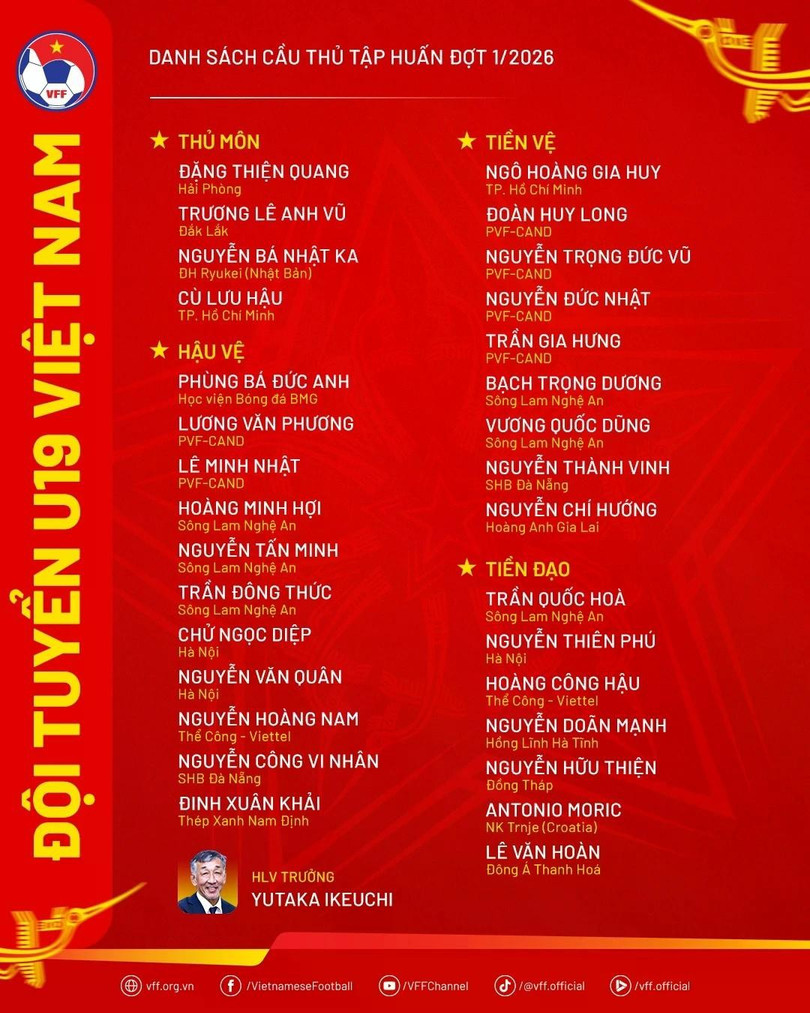 Tuyển U19 Việt Nam công bố danh sách 31 cầu thủ tập trung đợt đầu tiên trong năm 2026.