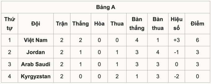 Chiến thắng Kyrgyzstan 2-1 giúp Việt Nam dẫn đầu bảng A với 6 điểm, còn đại diện Trung Á chưa giành điểm, đứng cuối. Trong khi đó, Jordan và Arab Saudi có cùng 3 điểm, nhưng chủ nhà xếp thứ ba vì kém hiệu số đối đầu. Cả bốn đội đều còn cơ hội vào tứ kết trước lượt cuối.