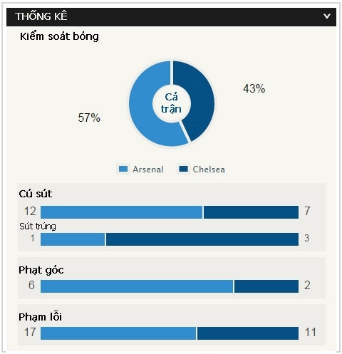 Đó cũng là một trong những hình ảnh thu nhỏ về trận đấu này: Jose Mourinho dường như đã tiên liệu hết những gì Arsenal có thể làm, giống như ông đã từng nói “tôi nắm mọi vũ khí của Man United trong túi áo” sau trận thắng Quỷ đỏ tuần trước. Trong khi đó, Arsenal mang đến cho NHM cảm giác họ đá ào ạt, đá nghệ thuật bằng những cú đánh gót chuyền bóng rất mềm, nhưng thực tế đã chứng minh, cả trận đấu, Pháo thủ mới bắn trúng đích đúng… 1 lần (sau 12 lần dứt điểm), còn Chelsea dù bị mang tiếng là phòng ngự đặt xe bus, nhưng họ có tới 3 lần bắt Ospina phải trổ tài.