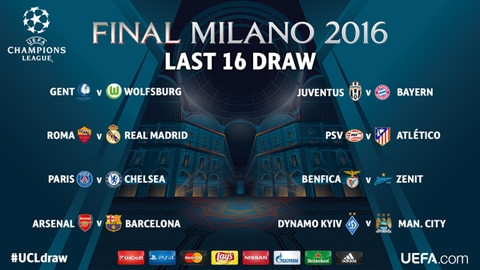 Kết quả bốc thăm vòng 1/8 Champions League Gent vs Wolfsburg AS Roma vs Real Madrid PSG vs Chelsea Arsenal vs Barcelona Juventus vs Bayern Munich PSV vs Atletico Madrid Benfica vs Zenit Dinamo Kiev vs Man City