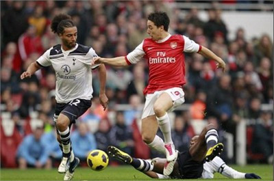 Dù đã chơi rất nỗ lực trong những phút cuối hiệp 1 song Tottenham không thể tìm được đường xuyên thủng hàng phòng ngự của đội chủ nhà. Bộ tứ tiền vệ của Arsenal đã có một hiệp đấu chơi khá tốt khi kiểm soát được bóng và điều tiết được nhịp độ trận đấu. Đáng lẽ tỷ số có thể được nâng lên 3-0 trước khi hiệp 1 kết thúc nếu Chamakh thực hiện thành công đường kiến tạo của thủ quân Fabregas.