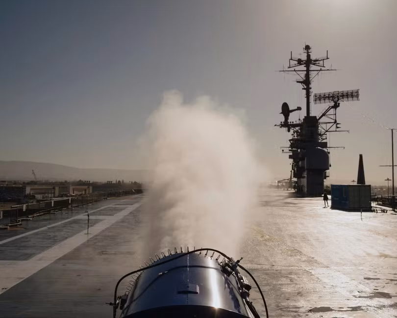 9h sáng, kỹ sư Matthew Gallelli đã bắt đầu làm việc trên boong của một con tàu sân bay đã ngừng hoạt động giữa Vịnh San Francisco, đeo một cặp bảo vệ tai và bật công tắc.