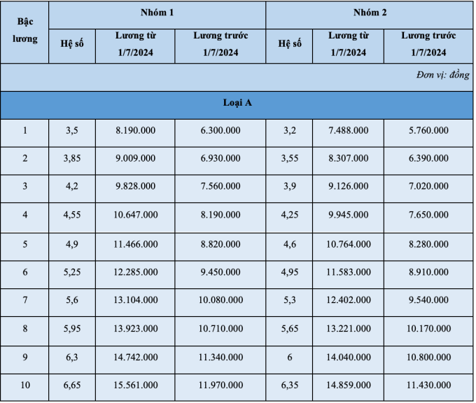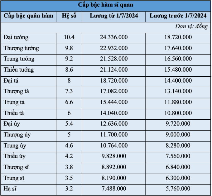 Từ ngày 1/7, lương của đại tướng cao nhất hơn 24,3 triệu đồng, chưa tính phụ cấp, thấp nhất là công nhân quốc phòng 6,3 triệu đồng.