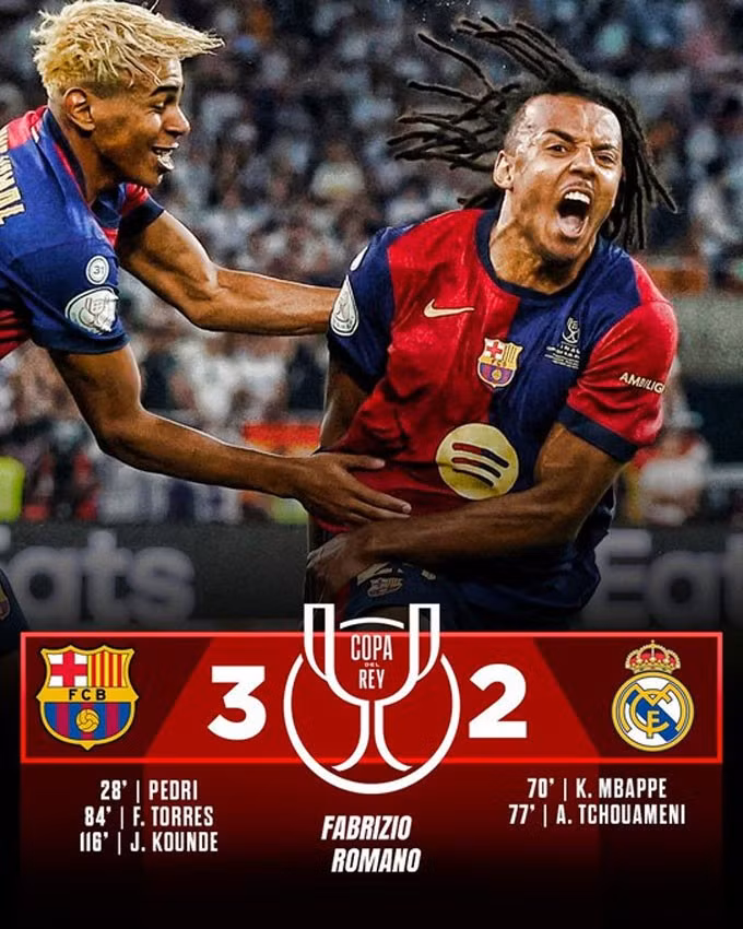 Bàn thắng Barca vs Real Madrid: Barca: Pedri (28'), Torres (84'), Kounde (116'); Real Madrid: Mbappe (70'), Tchouameni (77')