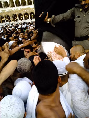 Các tín đồ hành hương rất muốn hôn hòn đá, nếu không hôn được, họ dùng tay để tiếp cận.