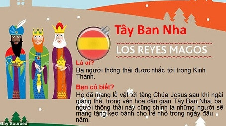 Ở Tây Ban Nha, trẻ nhỏ lại chờ ba vị đạo sĩ thông thái được nhắc tới trong Kinh Thánh đem kẹo bánh tới trong ngày Lễ hiển linh 6/1.