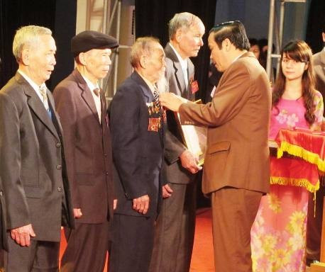 | Bí thư Tỉnh ủy Nguyễn Thanh Bình trao Huy hiệu 50, 55, 60 tuổi đảng cho 12 đồng chí thuộc 12 huyện, thành, thị ủy đại diện cho 319 đảng viên trong toàn tỉnh được trao tặng trong năm 2013. |