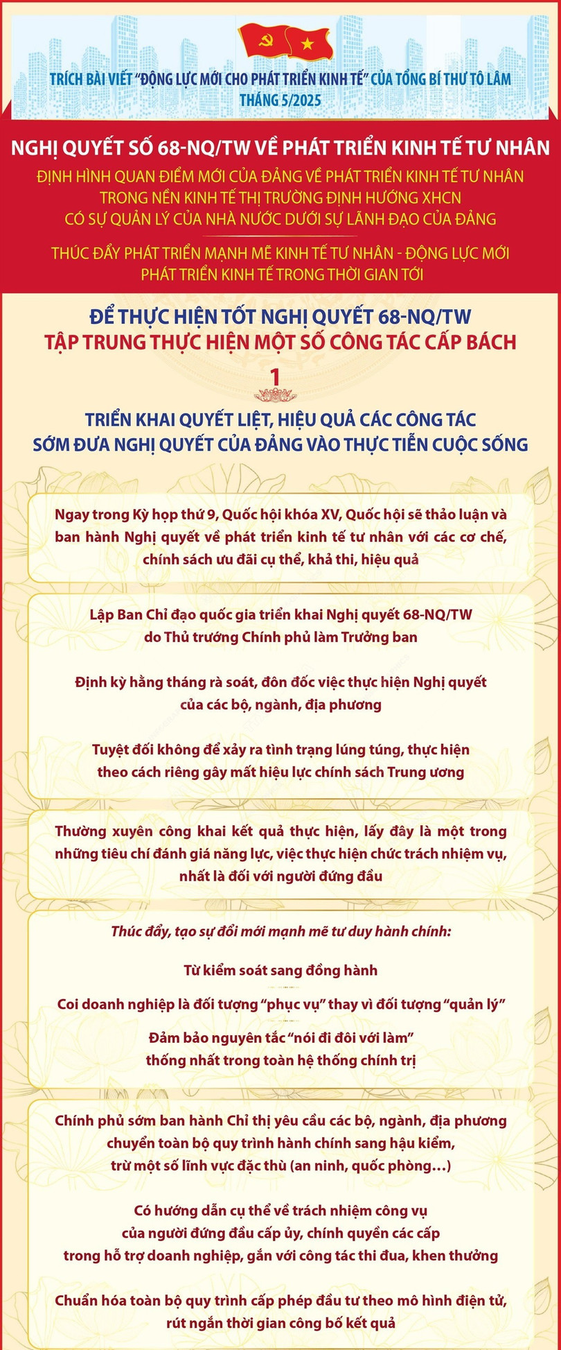 Theo Tổng Bí thư Tô Lâm, để thực hiện thắng lợi Nghị quyết số 68 về phát triển kinh tế tư nhân, cần tập trung thực hiện một số công tác cấp bách, sớm đưa Nghị quyết của Đảng vào thực tiễn cuộc sống.
