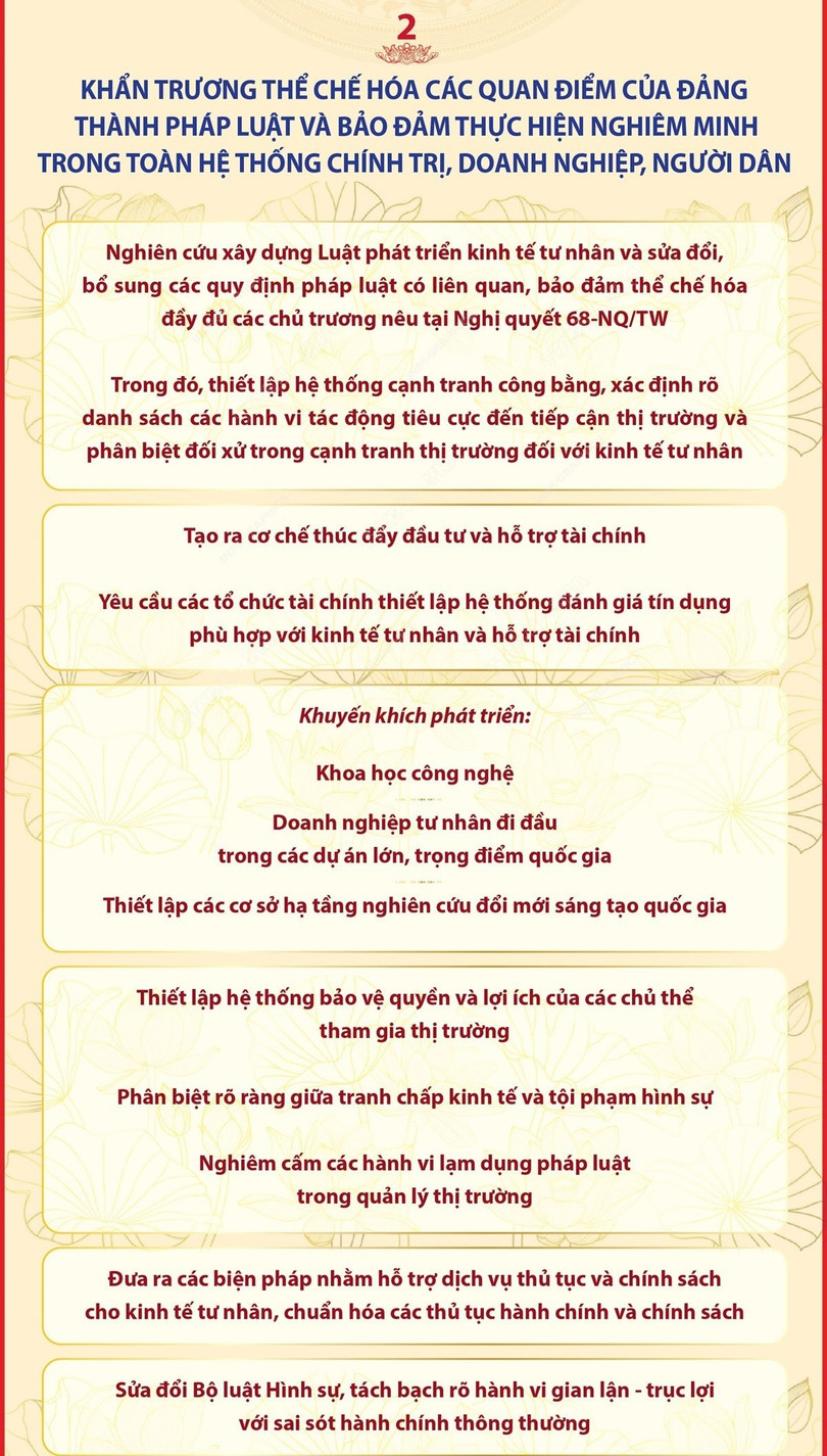 Thứ hai, khẩn trương thể chế hóa các quan điểm của Đảng thành pháp luật và bảo đảm thực hiện nghiêm minh trong toàn hệ thống chính trị, doanh nghiệp, người dân.