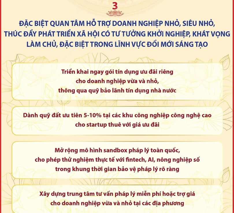 Thứ ba, đặc biệt quan tâm hỗ trợ doanh nghiệp nhỏ, siêu nhỏ, thúc đẩy phát triển xã hội có tư tưởng khởi nghiệp, khát vọng làm chủ, đặc biệt trong lĩnh vực đổi mới sáng tạo.