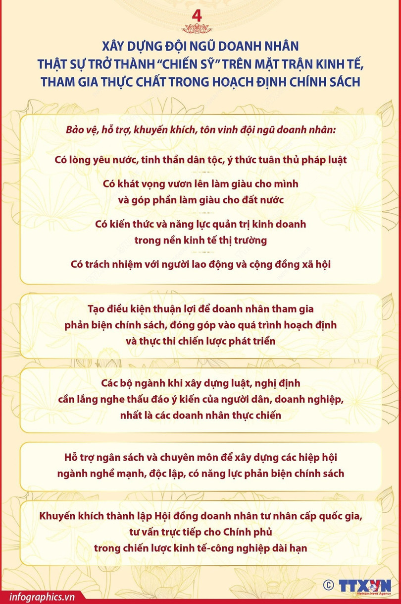 Thứ tư, xây dựng đội ngũ doanh nhân thật sự trở thành “chiến sỹ” trên mặt trận kinh tế, tham gia thực chất trong hoạch định chính sách.