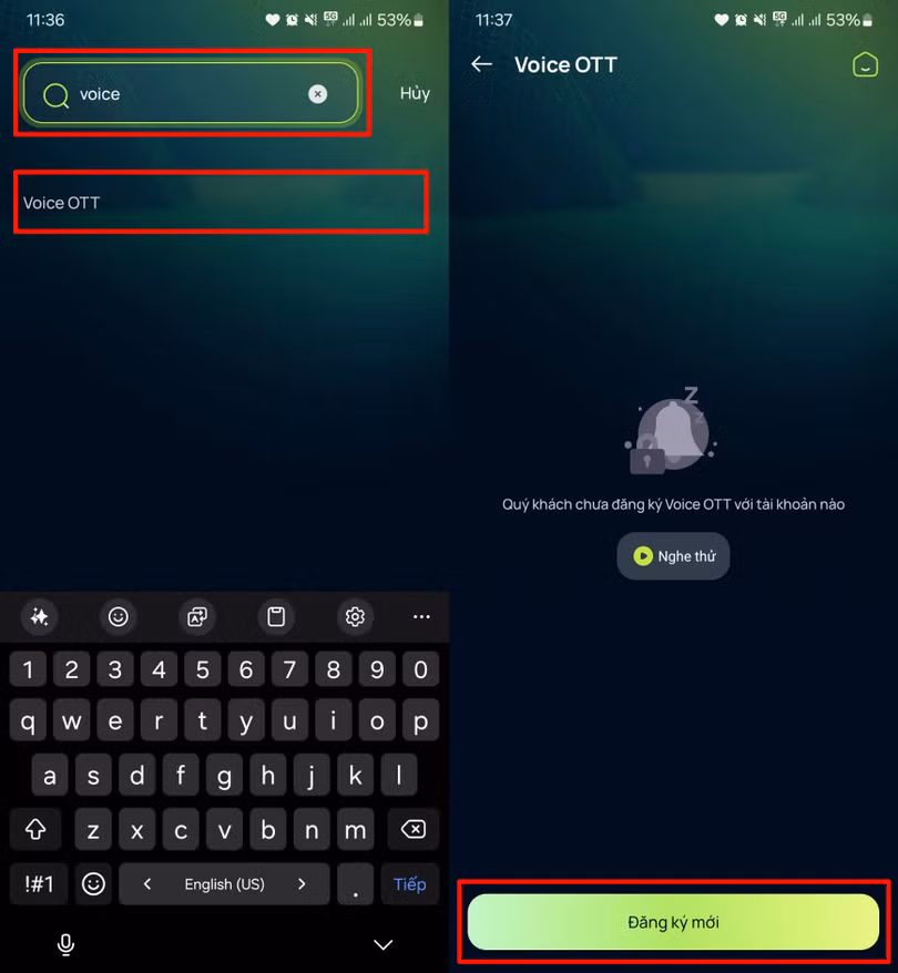 Bước 2: Nhập từ khóa Voice OTT vào ô tìm kiếm > Chọn Đăng ký mới để bắt đầu quá trình đăng ký dịch vụ.