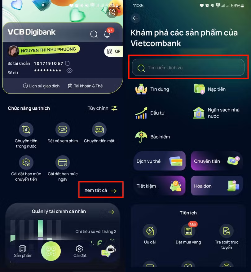 Bước 1: Mở ứng dụng Vietcombank trên điện thoại, tại giao diện trang chủ hãy nhấn vào Xem tất cả để hiển thị danh sách đầy đủ các tính năng > Chọn Thanh tìm kiếm.