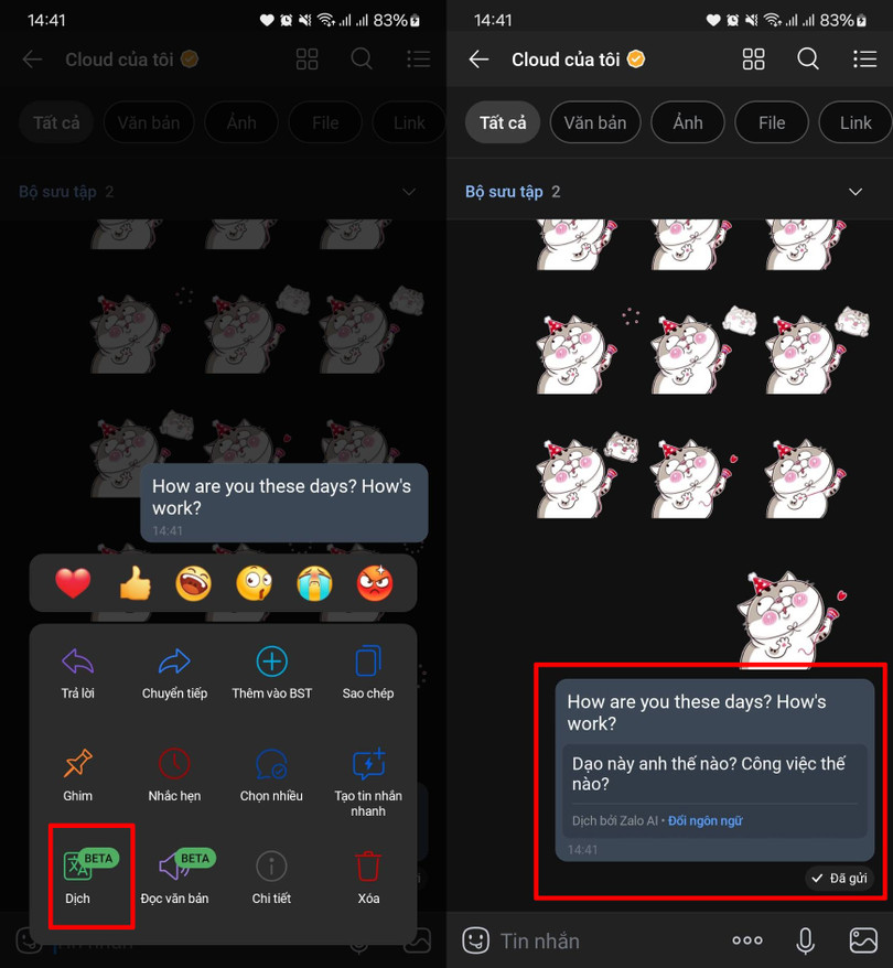 Bước 3: Nhấn chọn vào mục Dịch, ngay lập tức Zalo sẽ dịch tin nhắn trên màn hình cho bạn.