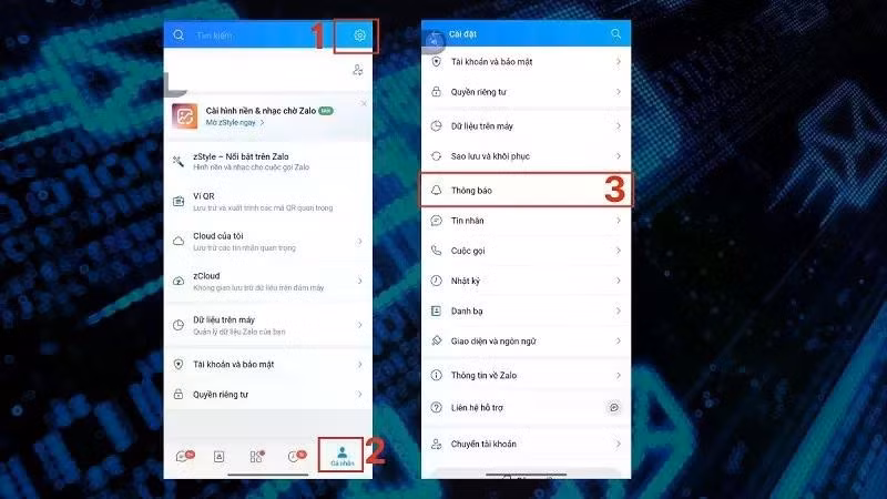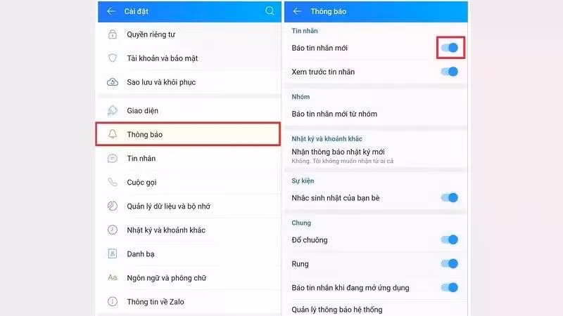 Bước 1: Để nhận thông báo tin nhắn mới trên ứng dụng Zalo, bạn truy cập vào mục Cài đặt trong Zalo, chọn tiếp mục Thông báo và bật tính năng Báo tin nhắn mới.