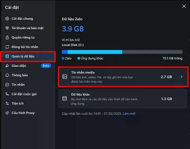 Bước 2: Lúc này, bạn nhấn vào mục Quản lý dữ liệu để có thể xem Zalo đã tốn bao nhiêu dung lượng trên máy tính.