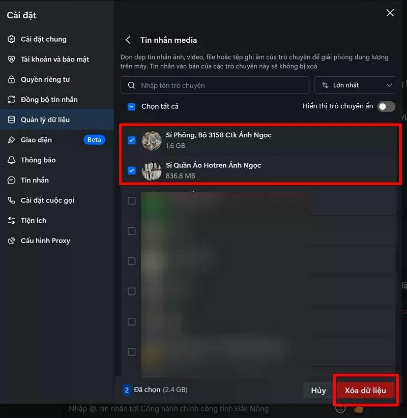 Bước 3: Tiếp đến, bạn hãy bấm vào cuộc trò chuyện chiếm nhiều dung lượng nhất. Nhấn chọn tiếp vào mục Xóa dữ liệu để dọn dẹp bộ nhớ.