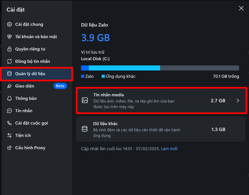 Bước 2: Chọn tiếp vào mục Quản lý dữ liệu để có thể xem dược Zalo đã tốn bao nhiêu dung lượng trên máy tính của bạn.