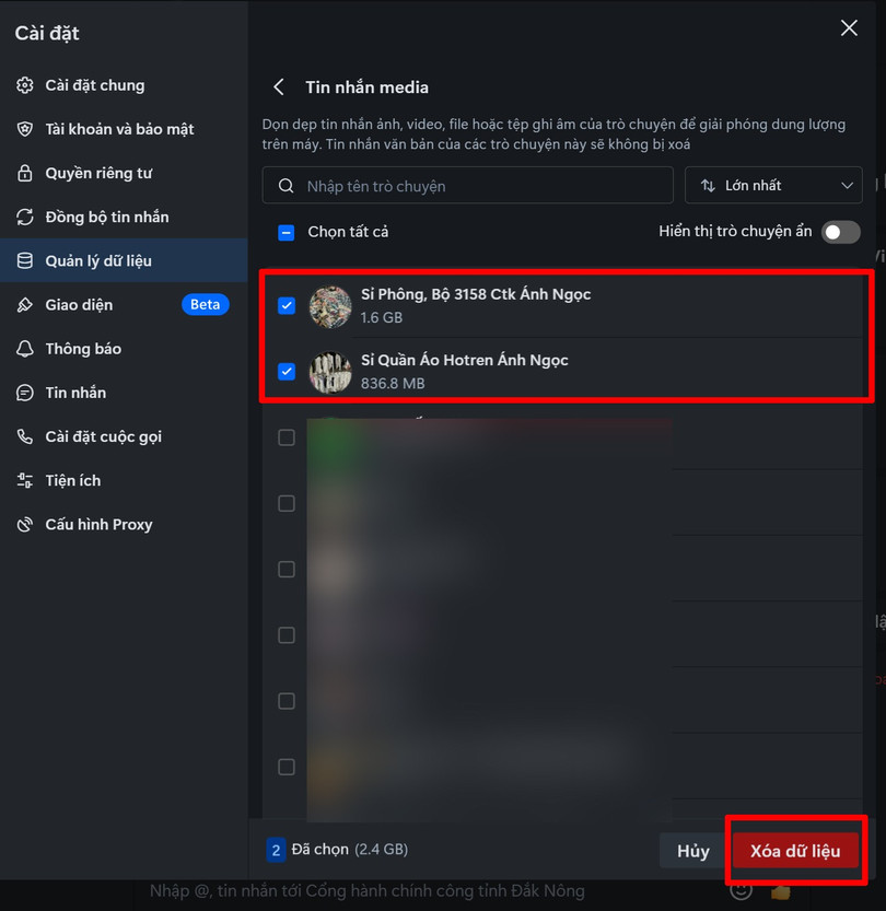 Bước 3: Chọn vào cuộc trò chuyện chiếm nhiều dung lượng nhất > Nhấn chọn tiếp vào mục Xóa dữ liệu là được.