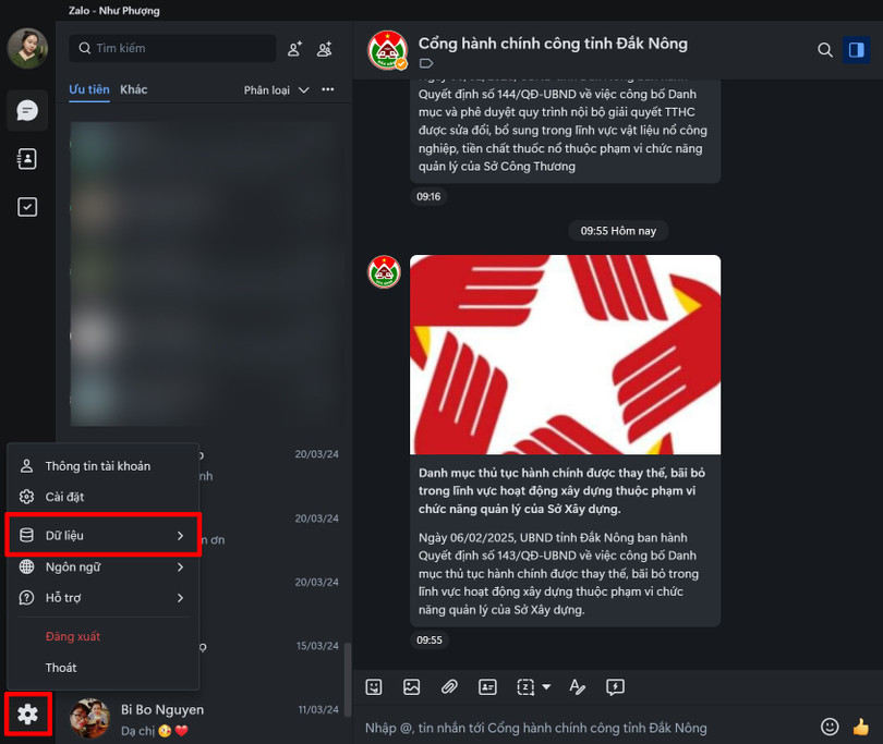 Bước 1: Mở ứng dụng Zalo trên máy tính của bạn lên > Nhấn chọn vào mục Cài đặt > Chọn tiếp đến mục Dữ liệu.