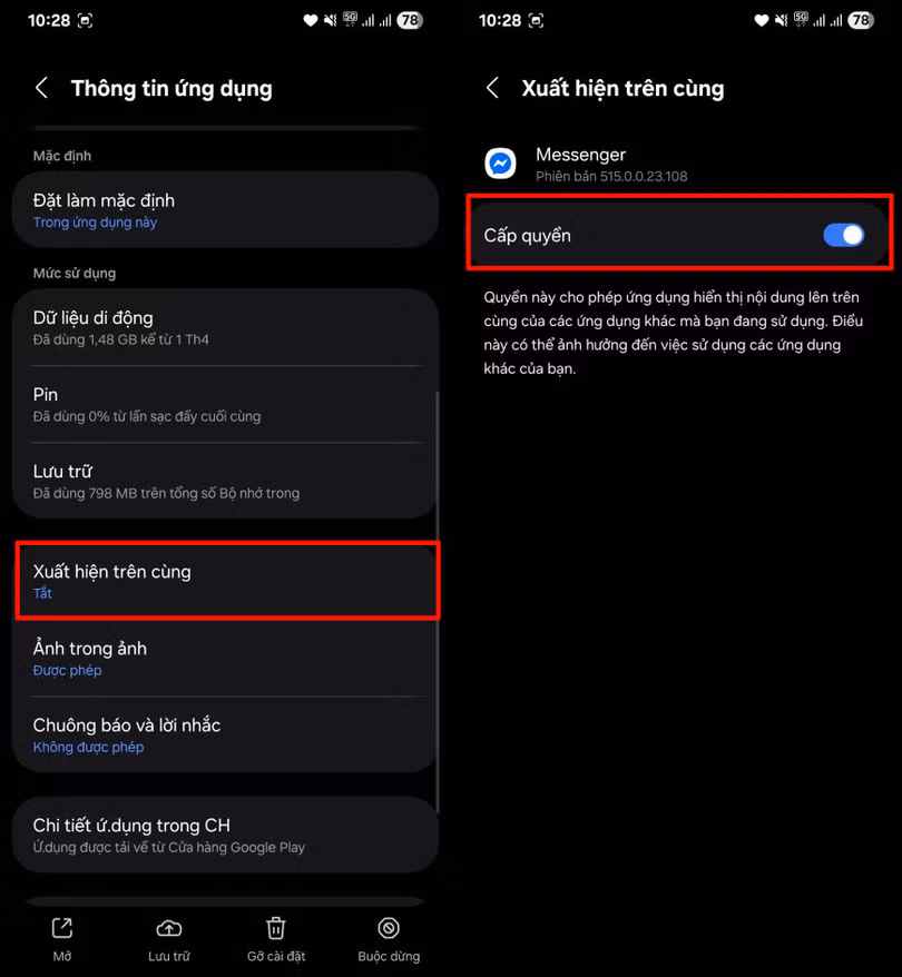 Để bong bóng chat Messenger hoạt động trơn tru, việc kiểm tra lại cài đặt trên điện thoại là điều không thể bỏ qua. Tính năng này yêu cầu được cấp quyền hiển thị trên cùng để có thể nổi lên khi bạn đang dùng các ứng dụng khác.