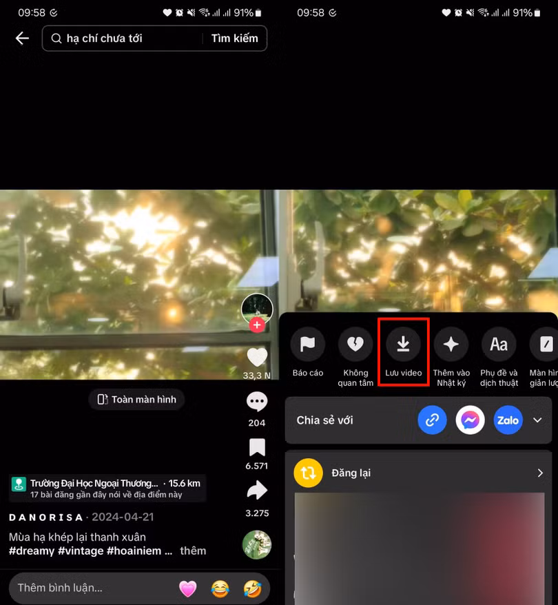 Bước 1:Nhấn giữ vào video TikTok có chứa đoạn nhạc bất kỳ > Chọn Tải về để lưu video về máy.