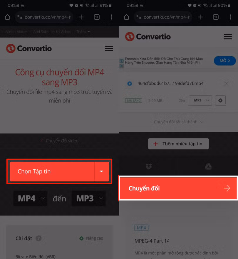 Bước 2: Nhấn vào link bên dưới > Nhấn nút Chọn tập tin > Tải video vừa lưu máy của bạn lên > Chờ trang tải xong hãy Tải âm thanh của video đó về máy.