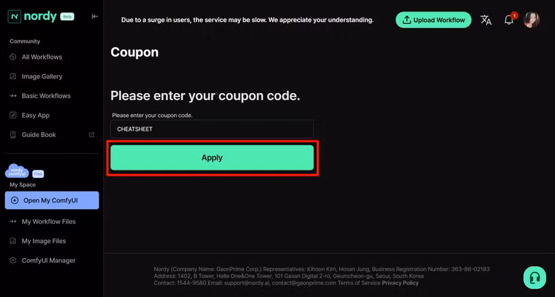 Tiếp theo, chọn Apply để áp dụng mã. Bạn không cần phải nhập mã vì hệ thống sẽ tự động điền nha. Nhập xong bạn sẽ nhận ngay 12.500 credit miễn phí, số credit này sẽ được dùng để chạy các tác vụ như phục hồi ảnh cũ và tác vụ khác trong Nordy AI mà không cần mất phí.