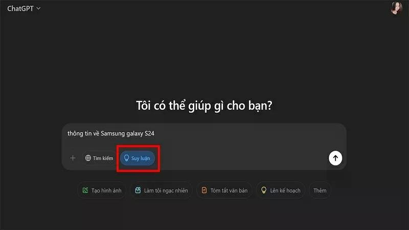 Bước 2: Tại đây, bạn nhập bất kỳ một nội dung để nhờ ChatGPT trả lời. Sau khi nhập xong, bạn hãy chọn mục Suy luận.