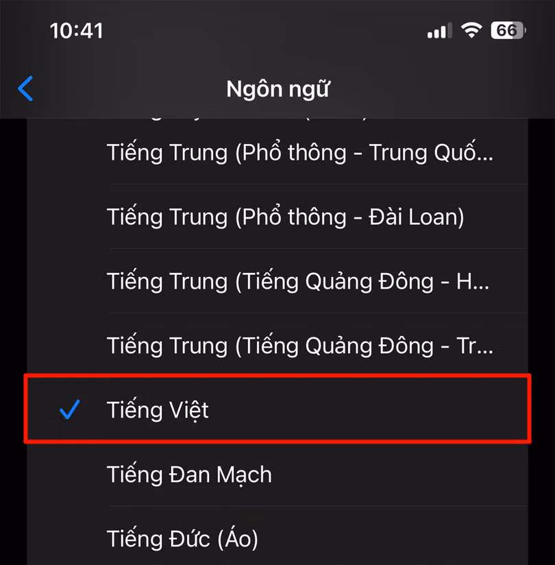 Bước 2: Kéo xuống và chọn ngôn ngữ Tiếng Việt là xong.