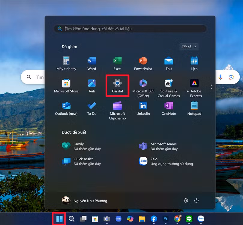 Bước 1: Nhấn vào biểu tượng Windows trên máy tính của bạn > Chọn tiếp vào mục Cài đặt.