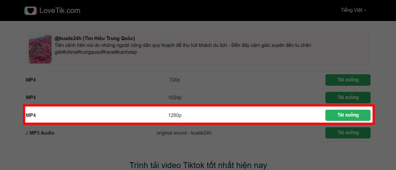 Bước 5: Chờ một lát để LoveTik làm việc, bạn sẽ thấy video cần tải hiển thị ngay trên màn hình > Chọn vào mục Tải xuống là có thể tải được video rồi đấy.