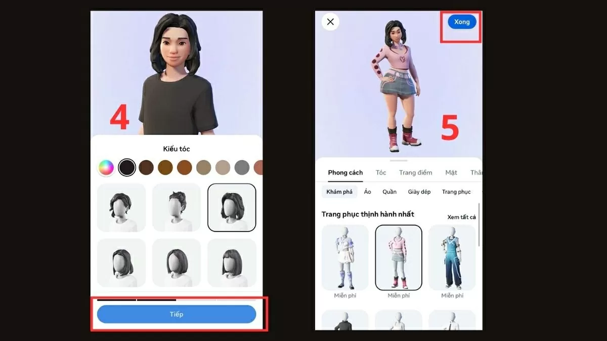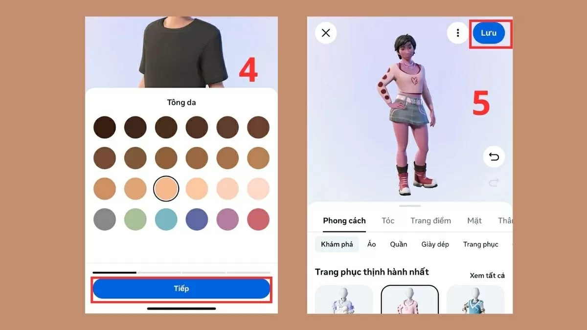Bước 4: Tùy chỉnh nhân vật theo sở thích: màu da, kiểu tóc, khuôn mặt, trang phục và phụ kiện, sau đó nhấn Tiếp.