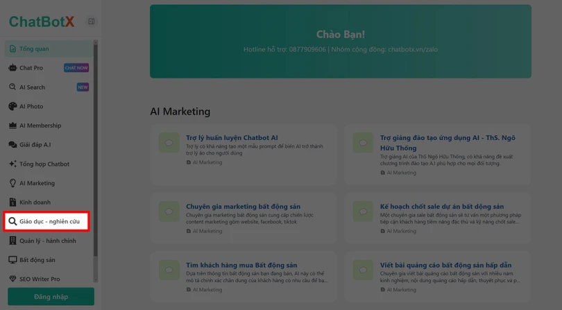 Bước 2: Ngay tại trang chủ > Nhấn chọn vào mục Giáo dục nghiên cứu để tiến hành tạo đề thi trắc nghiệm mới.