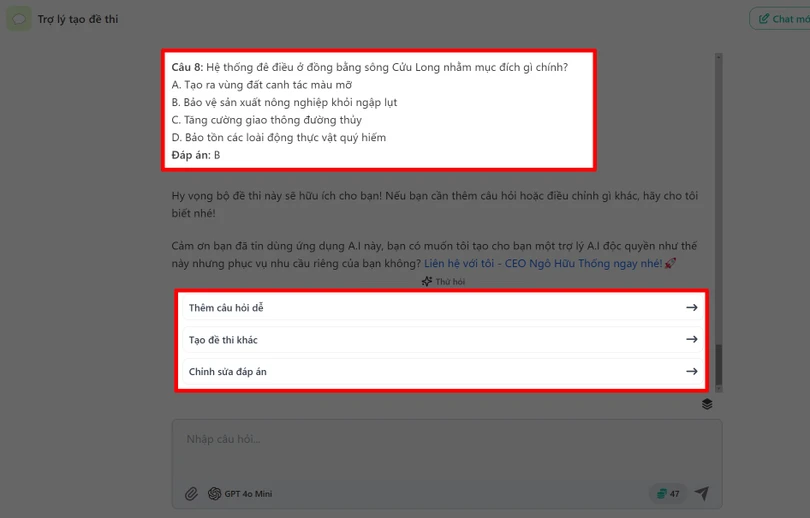 Bước 5: Ngay lập tức ChatBotX sẽ tạo cho bạn một bộ đề thi mẫu. Nếu muốn tạo bộ đề khác kéo xuống dưới và nhấn vào là xong nha.