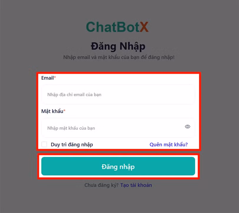 Bước 1: Truy cập vào trang chủ của ChatBotX bên dưới > Tiến hành đăng nhập hoặc đăng ký tài khoản để hoạt động.