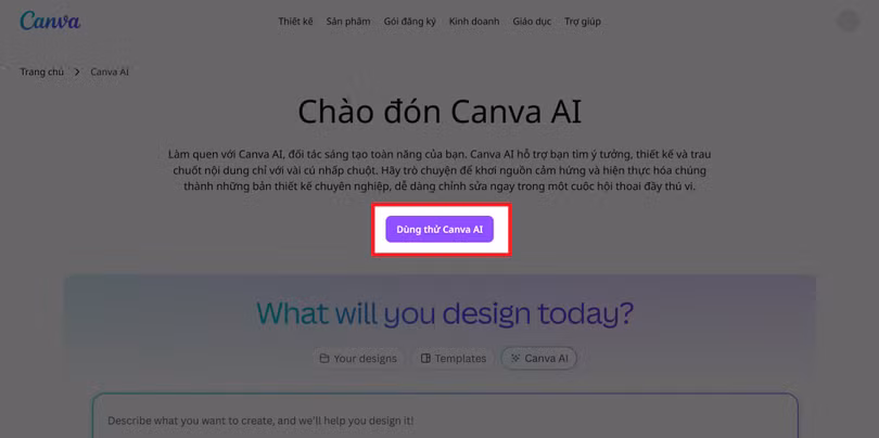Bước 2: Nhấn chọn Bắt đầu dùng thử Canva AI để truy cập vào công cụ thiết kế bằng AI.